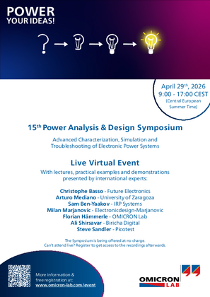 The OMICRON Lab Power Analysis & Design Symposium is an annual event focusing on advanced characterization, simulation, and troubleshooting of board-level power-electronic systems. International experts from the field include practical examples and demonstrations in their lectures.